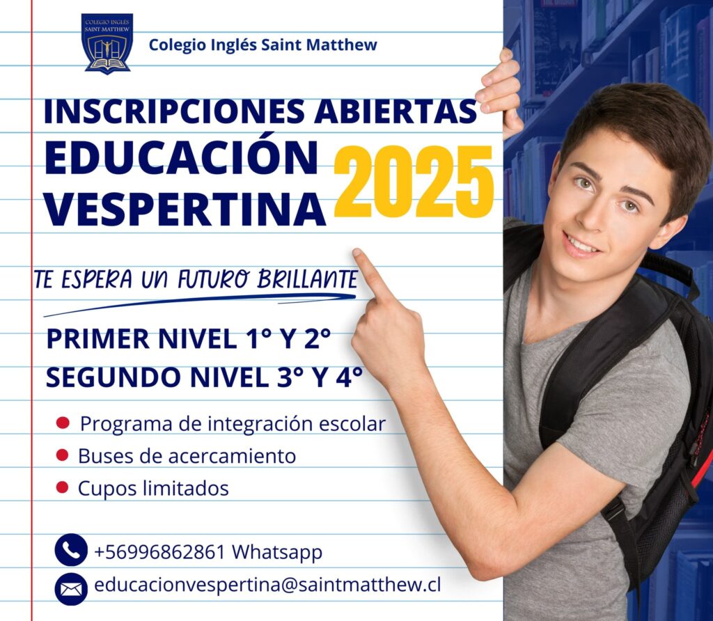 Si aún no has completado tu educación media, esta es tu oportunidad. En nuestra modalidad vespertina, podrás avanzar en tu formación con un programa flexible y de calidad, pensado para quienes desean compatibilizar sus estudios con otras responsabilidades.